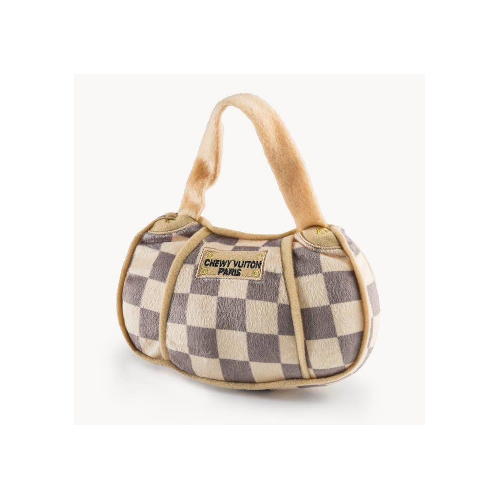 Plyšová hračka Checker Chewy Vuiton Handbag je stelesnením štýlu a zábavy – čierny monogramový dizajn pripomína ikonické módne kúsky z Paríža a ukrýva pískatko, ktoré psy milujú. Ideálna ako vtipný darček aj štýlový doplnok do interiéru.