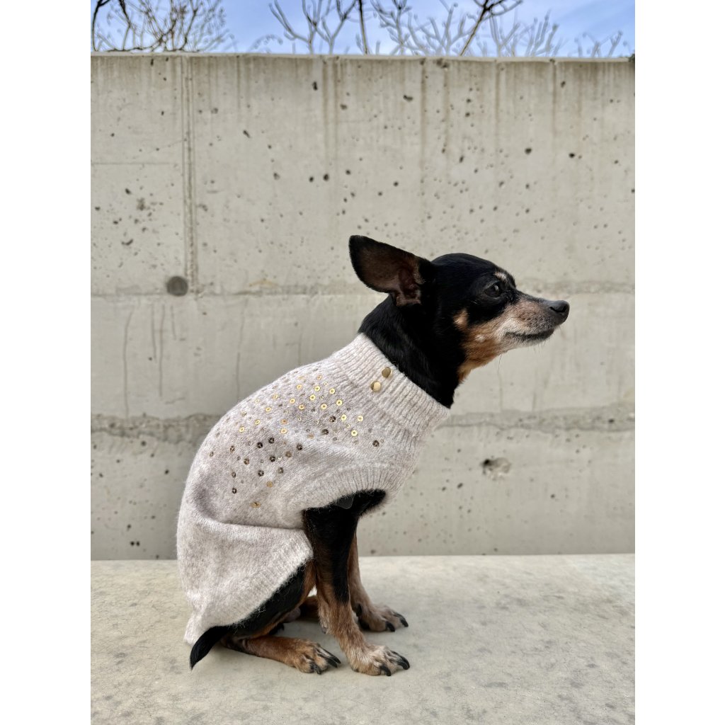 Tento elegantný úplet sa vyznačuje jemnou melírovanou textúrou v béžových a taupe tónoch, ktorú krásne zvýrazňuje gradient zlatých flitrov na ramenách pre jemný, luxusný lesk. Dva malé zlaté gombíky na golieri dodávajú nadčasový šarm, zatiaľ čo kovová platnička „Milk&Pepper“ na zadnej strane dotvára prémiový vzhľad.