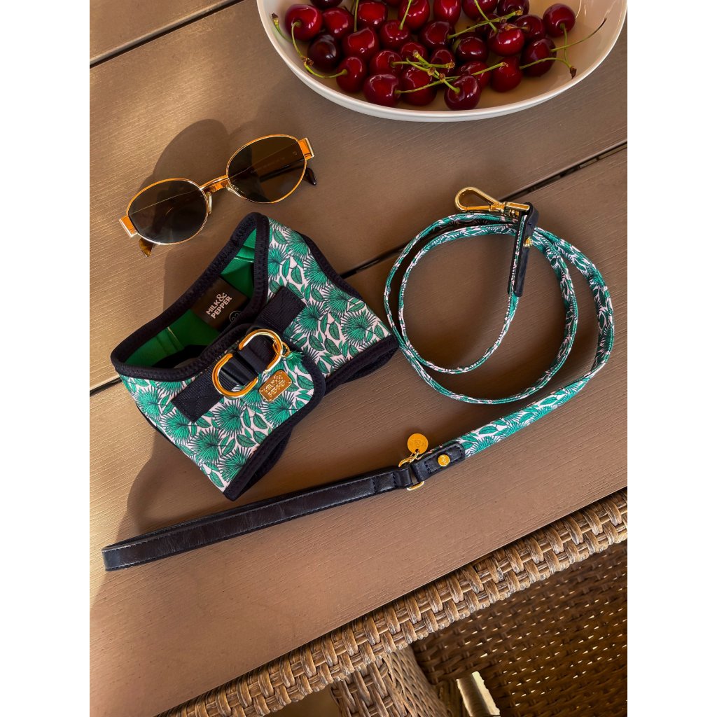Letný postroj pre malých a stredných psov s tropickou potlačou v odtieňoch zelenej, ružovej a námorníckej. Má jemnú zelenú podšívku, strapec ako ozdobu, nylonové prvky a zlaté kovanie. Zapínanie pomocou suchého zipsu a plastovej spony zaisťuje komfortné a rýchle nasadenie.