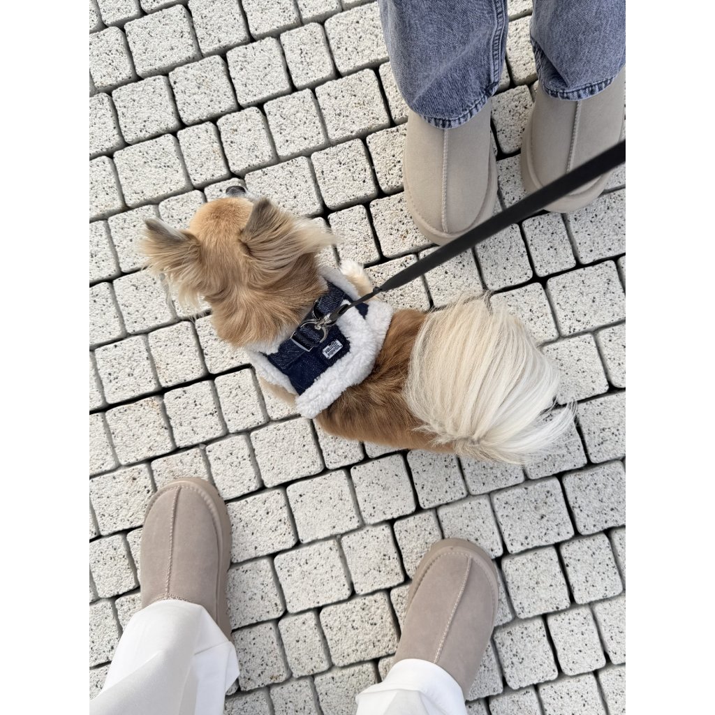 Vyrobený z prémiovej modrej džínsoviny a podšitý mäkkou umelou kožušinou z ovčej kože, tento postroj udrží vášho chlpatého kamaráta v teple a zároveň púta pozornosť na každej prechádzke. Titánová spona a pracka zaisťujú bezpečné uchytenie a široké zapínanie na suchý zips umožňuje rýchle a jednoduché obliekanie.